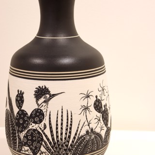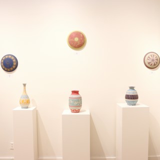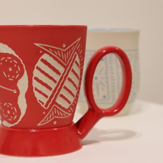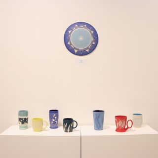 Casey’s work in this show illustrates the range of his abilities, from functional ceramics like mugs and bowls to wall-hung pieces and sculpture. Each piece is totally unique, showcasing Casey’s characteristic intricate surface design and wide, bright color palette. “My work hinges on improvisation,” Casey says, explaining that each piece has an idiosyncratic set of rules that guide its design, meaning that no two pieces will ever be the same. He begins with color, then divides the space into sections that will each have their own design. “I tackle each space individually, so even I don’t know what the end result will be—this approach keeps it fun and unpredictable for me,” he says. He builds the designs piece by piece using sgraffito, usually beginning by choosing a carving tool to make the initial marks that will set the tone for the design—for example, a V-tip carving tool lends itself to arcs, dashes and straight lines, while a clean-up tool can create more irregular, random shapes.