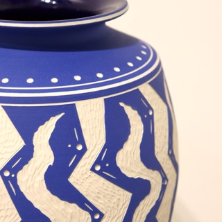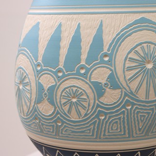 Chris Casey’s ceramics explore the space between the concrete and the abstract, the familiar and the foreign, teasing the human mind’s urge to look for order in chaos. Drawing inspiration from the intricate construction of machinery, technology and the worlds of science fiction, Casey’s elegantly executed forms and mesmerizing surface designs offer a playground of color, pattern and texture.