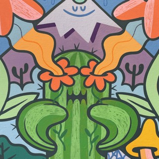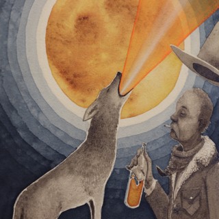 British illustrator Faye Moorhouse is known for painting worlds inhabited by strange people, violent beasts and other grotesqueries, but she has recently been drawn to painting birds. When she was invited to create a piece for Sound and Vision, she knew immediately that her piece would be based on the Australian nursery rhyme “Kookaburra sits in the old gum tree,” a song she has loved since she was young. “Even now I will still sing it, usually in times of sheer sensory overwhelm when looking after my young children—it instantly calms me,” she says.